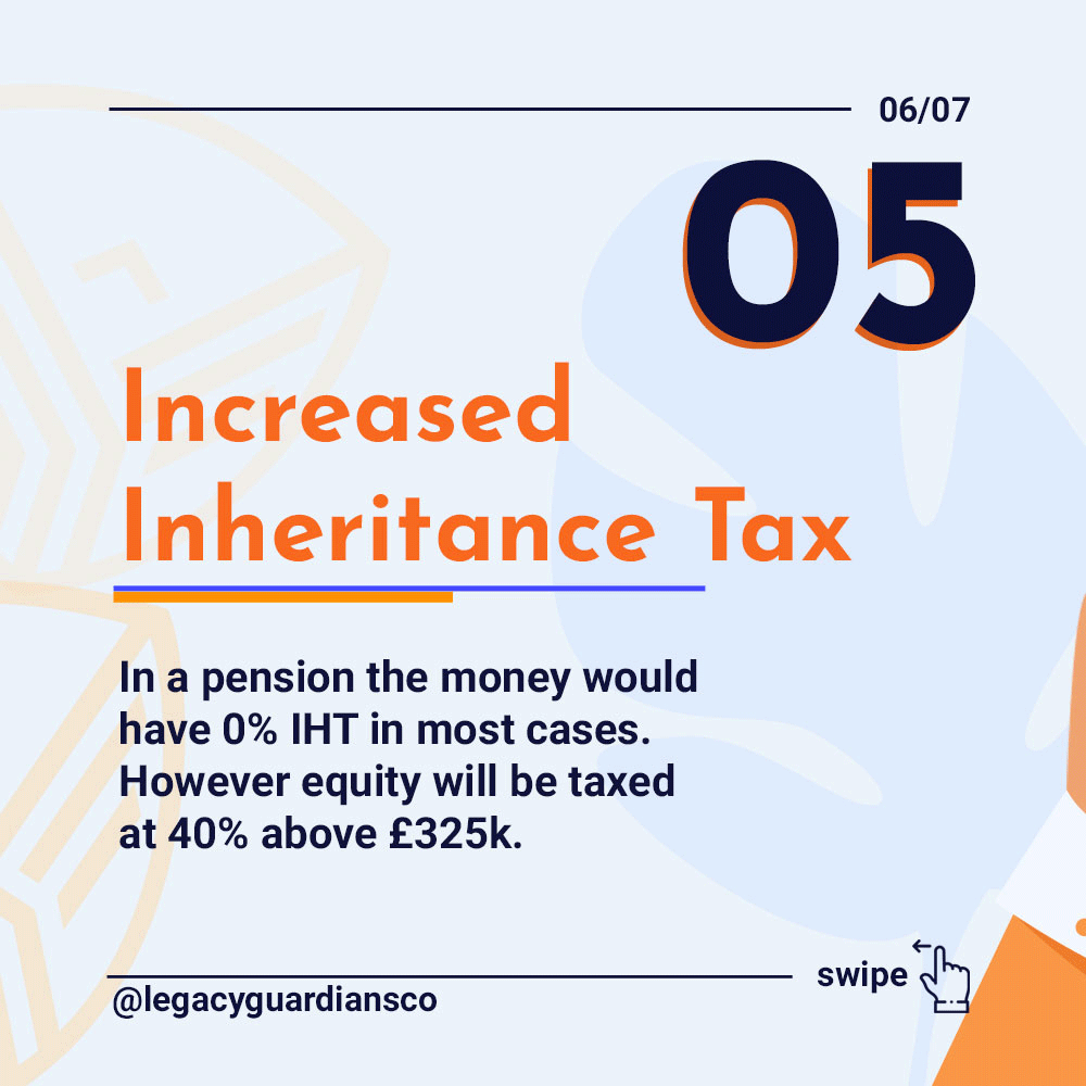 In a pension the money would have 0% IHT in most cases. However, equity in a property will be taxed at 40% above £325k.