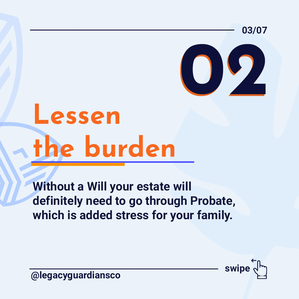 Without a Will your estate will definitely need to go through Probate, which is added stress for your family.