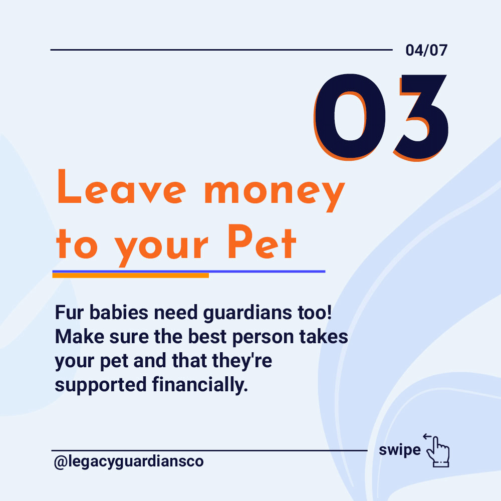 Fur babies need guardians too! Make sure the best person takes your pet and that they’re supported financially.